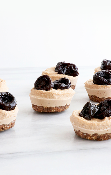 To prepare the filling, drain cashews, Rinse and drain again, then place in a food processor remaining filling ingredients and process until smooth. Place equal amounts of cheesecake filling over each crust and spread evenly. Tap the pan on the counter several times to help the layers settle. Top with whole, sliced or diced prunes.