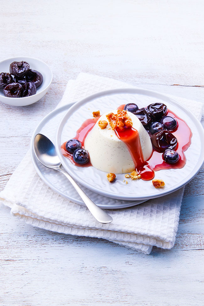 Dip the ramekins briefly in hot water to loosen the panna cotta before turning out onto a plate. Serve with the blueberry and prune compote and the caramelised walnuts.