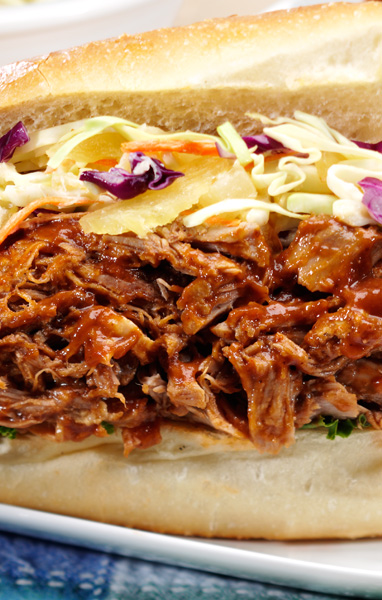Heat a heavy-bottomed frying pan over high heat 3 to 4 minutes, add 2 Tbsp olive oil. Season the pork roast with salt on all sides and brown in the pan, 3 minutes per side. Put pork in a crock pot. Add the onions, broth and liquid smoke. Cook the pork 10 to 12 hours on a low setting. Alternatively, put the browned roast in oven with 2 cups of broth and 1/8 tsp liquid smoke and bake, covered 3 to 4 hours at 160°C. When meat is cool enough to handle, remove fat and shred the meat. Toss with Sunsweet® Prune BBQ Sauce (recipe to follow) and serve piled high on toasted buns or slider rolls.