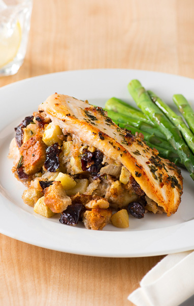 Preheat oven to 190°C. Grease a 7×11 inch baking dish. Place croutons in a medium bowl and pour stock over top; let stand for 5 minutes. Melt butter in a skillet set over medium heat. Add apple, onion and rosemary. Cook, stirring, for 10 minutes or until tender. Add to crouton mixture. Stir in walnuts and prunes. Slice each chicken breast in half through centre, keeping the edge intact so it opens like a book. Season all over with salt and pepper. Stuff each evenly with crouton mixture and fold to close. Place in prepared baking dish. Brush herb butter over chicken breasts. Bake for 1 hour or until juices run clear when chicken is pierced and internal temperature reaches 75°C.